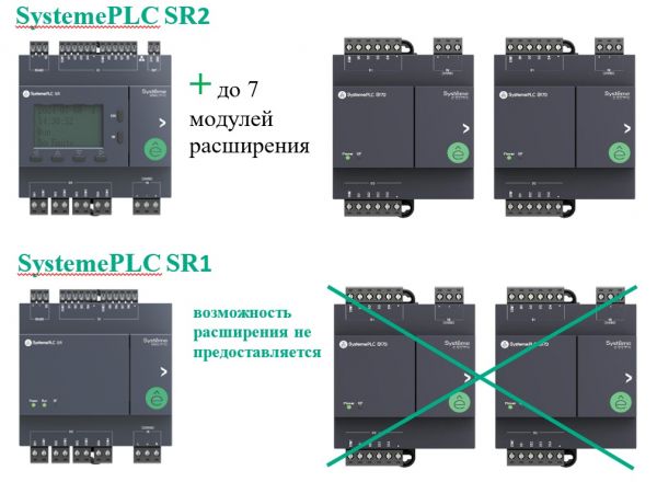 Линейка включает в себя два типа моделей: SystemePLC SR1 и SystemePLC SR2. Первые модели SR1 поставляются без дисплея, а вторые (SR2) оснащены дисплеем 1,8 дюйма. Устройства предлагают различные конфигурации встроенных входов/выходов: 6DI, 4DO(R), 2AI / 8DI, 4DO(R) / 8UI, 4DO(R;T) / 12DI, 8DO(R), 4AI / 16DI, 8DO(R) / 16DI, 12DO(R). Напряжение питания составляет 24 VDC или ~220 VAC.